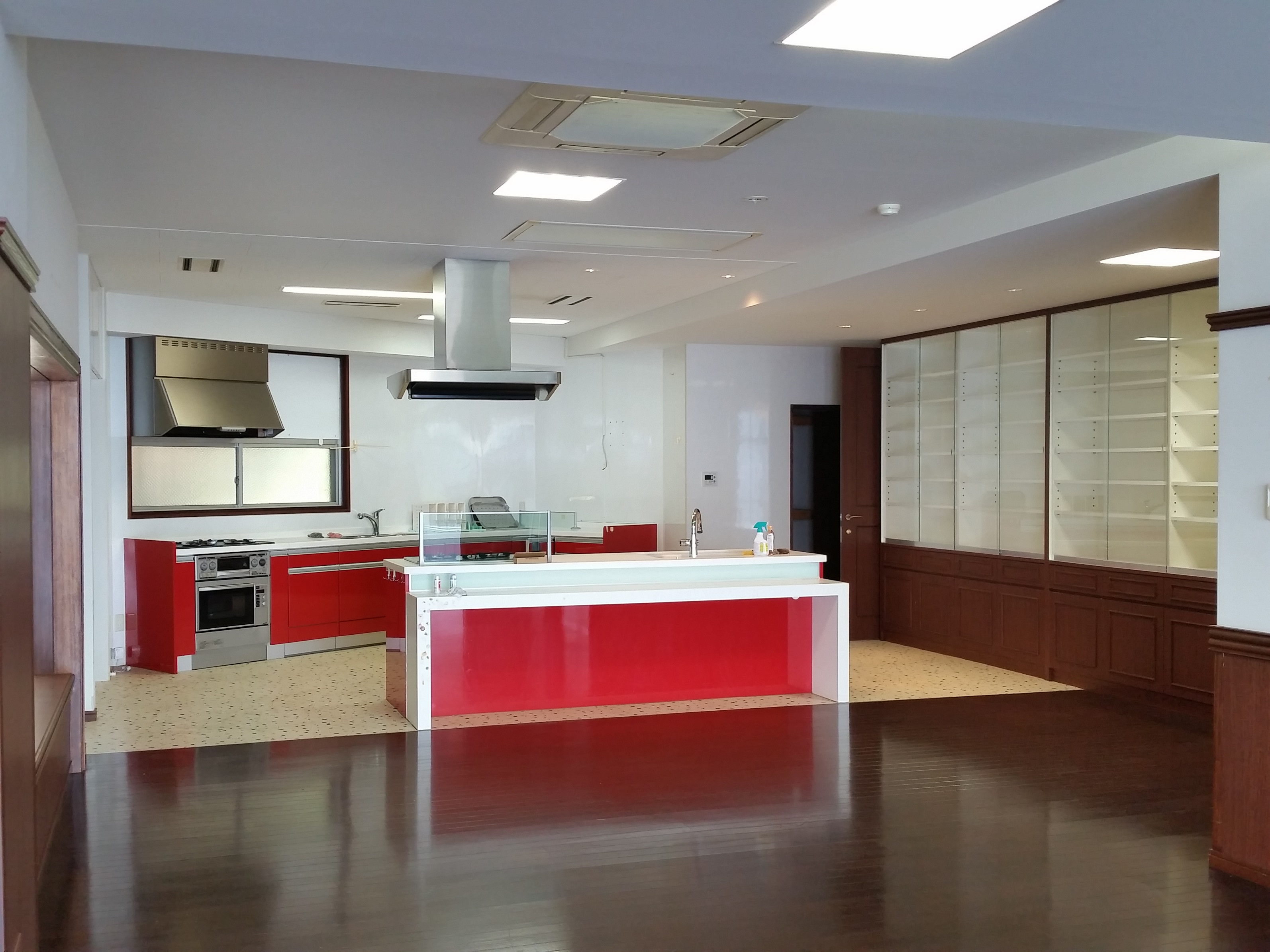 後ろに下がり撮影した写真ではオシャレな赤いキッチンががこんなにも小さく見えるほど。