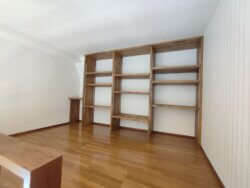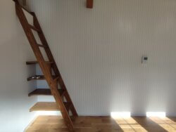 | 階段下をいかして、造作棚を♪ ロフトへの階段と同じ高さにすることで、 乗り降りの安心感へ繋がります。 |